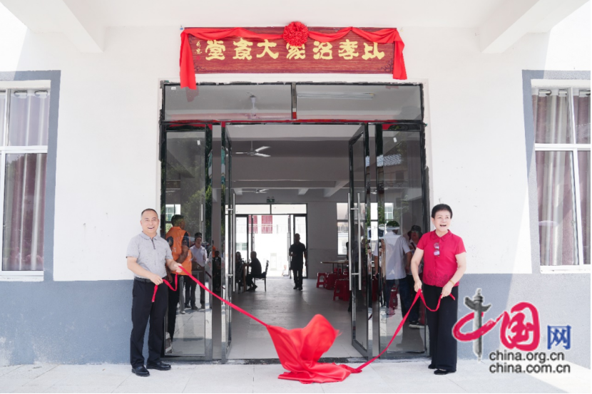 圖為江西省銅鼓縣委書記李勇軍(左一)與以孝治家運動倡議人、總謀劃吳紅(右一)為年夜塅集鎮社區以孝治家年夜食堂揭牌。杜添輝攝影